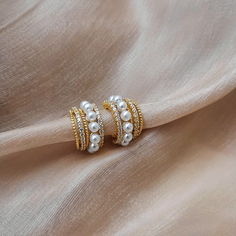 Introducing the Aylana Crystal Embedded Trinity Pearl Half Hoop Earrings, a pair of stunning half-hoop earrings that beautifully blend classic elegance with modern sparkle. Designed to capture the light and the attention, these earrings are the perfect addition to your curated jewelry collection.