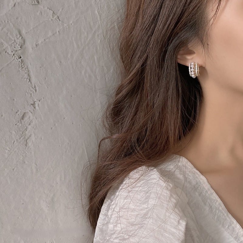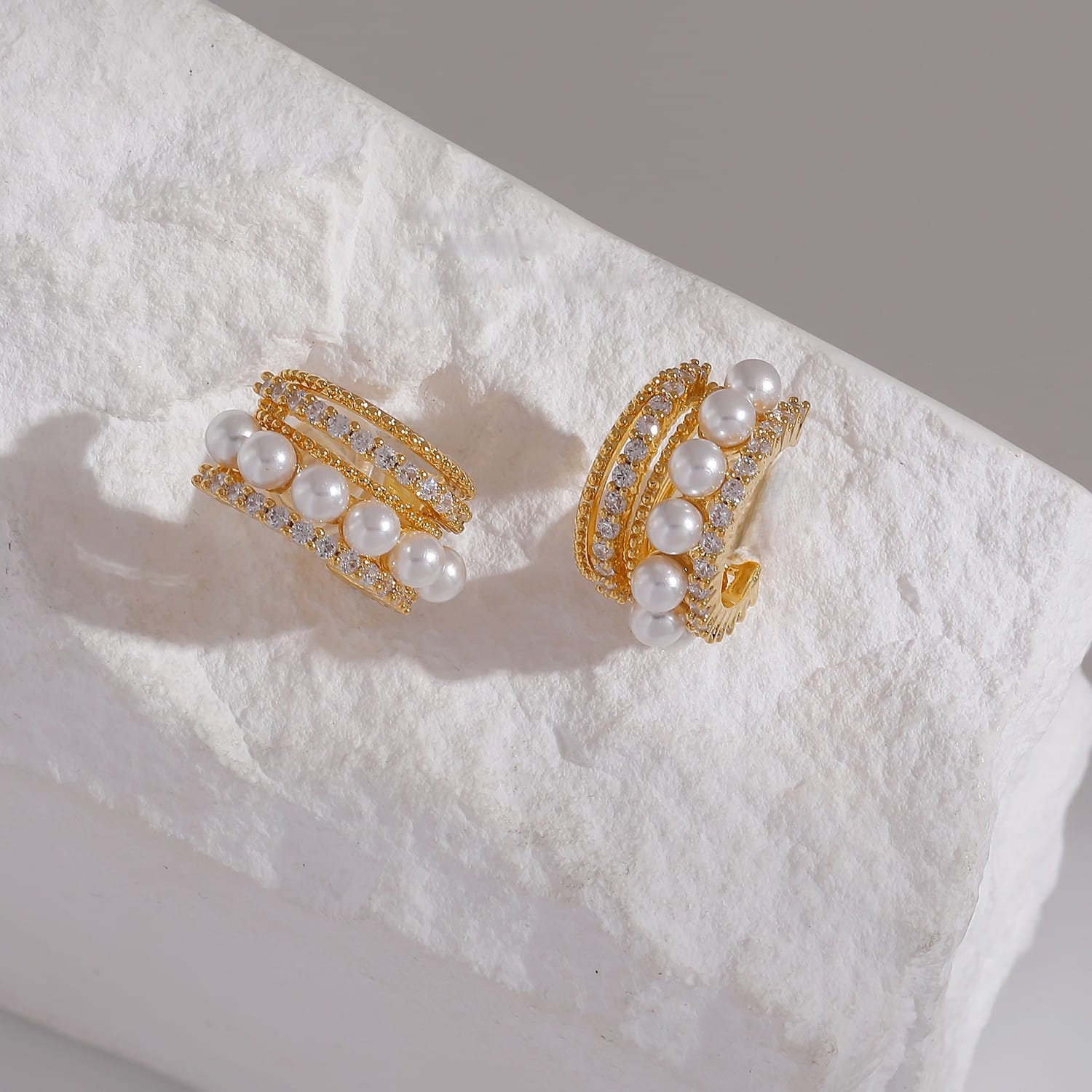 Crystal Embedded Trinity Pearl Half Hoop Earrings