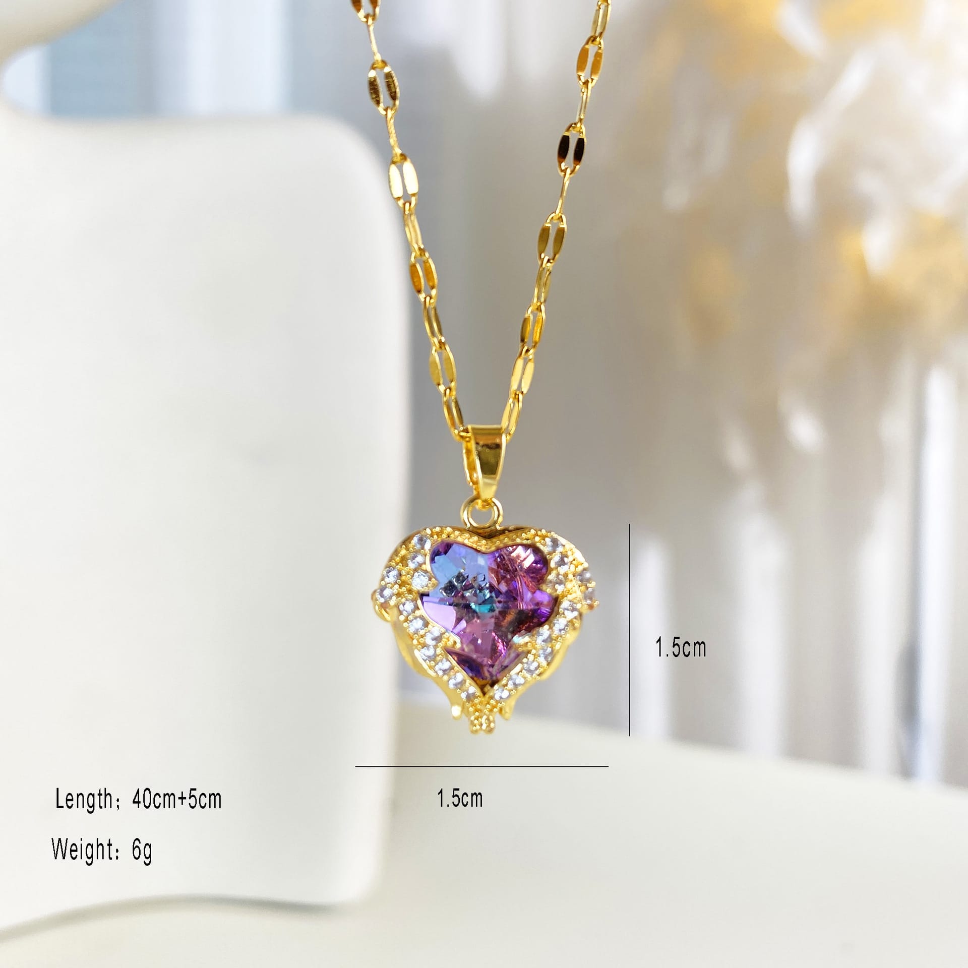 Shine with the Aylana Multi-Chromatic Heart Necklace. Gold-plated alloy with a radiant stone shifting from blue to purple and pink hues.
