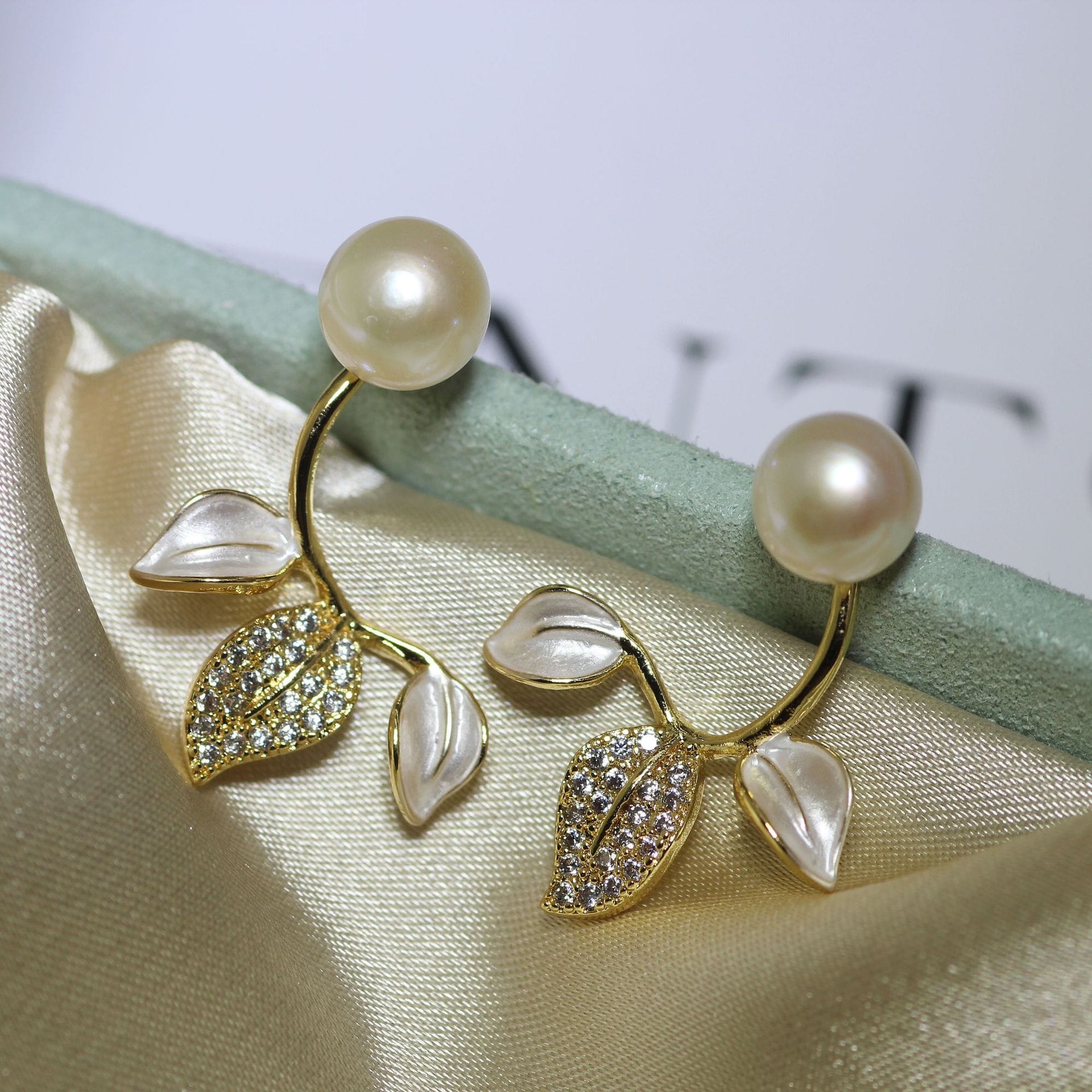 Shop Aylana Flora-Dew Pearl Stud Earrings for Women. Nature-inspired leaf studs with rhinestones and a golden finish. Elegant, lightweight, and perfect for the modern Indian woman.